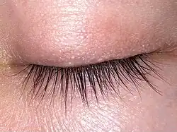 An eyelash (also called lash) (Latin: cilia) is one of the hairs that grows at the edges of the top and bottom eyelids, spanning outwards and away from the eye. The lashes grow in up to six layers on each of the upper and lower eyelids.[1] Eyelashes serve to protect the eye from debris, dust, and small particles, and are highly sensitive to touch, thus providing a warning that an object (such as an insect) is near the eye (which then closes reflexively). The eyelid margin from which lashes grow is among the most sensitive parts of the human body, with many nerve endings enveloping the roots of the lashes, giving it sensitivity to very light tactile input via the lashes,[2] enabling it to trigger the blink reflex when touched.[3] Eyelashes are also an important component of physical attractiveness, with prominent lashes drawing attention to the eyes.