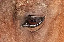 Lashes, being hair, are found in mammals. Camels' lashes are remarkably long and thick. Horses and cows feature eyelashes as well. Inherited eyelash problems are common in some breeds of dogs as well as horses.