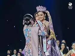Nariswari when crowned as the winner of Puteri Indonesia 2023 by her predecessor Laksmi De-Neefe Suardana and Putri Kuswisnu Wardani as Chair of the Puteri Indonesia Foundation, on 19 May 2023.