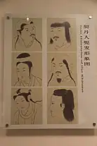Kithan's men hairstyle was called kunfa (髡髮) according to Chinese texts.[7]:21 Khitan wore the long side fringes & shaved pates.[11] Tomb murals of Khitan hairstyle show only some hair remaining near the neck and forehead with the rest of the head shaved.[12] Only at the temples were hair left while the crown was shaven.[10] The absence of Khitan clothes and hairstyles on a painting of riders previously identified as Khitan has lad to experts questioning their purported identity.[13] Khitan males grew hair from their temples but shaved the crown of their heads.[14] Khitan men might have differentiate between classes by wearing different patterns on their small braids hanging off their shaved foreheads. They wore the braids occasionally with a forehead fringe with some shaving off all the forehead.[3]:53,190 Khitan men left only two separate patches of hair on each of the forehead's sides in front of each ear in tresses while they shaved the top of their head.[14]