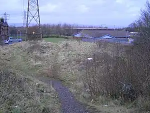 ![]() Site of former Ferguslie station. Aldi shop is on the right, Newton Terrace on the left. The main Glasgow to Ayr railway can be seen in the background. The photograph was taken from the national cycle track, formerly the Paisley Canal line which ran above the station. The bridge has been filled in. | |