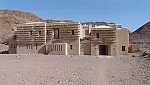 Feynan Ecolodge was developed to provide economic opportunities for local communities and generate revenue to conserve Jordan's wild places.[7] Feynan was also developed to provide a sustainable alternative to open cast copper mining as Wadi Feynan was historically one of the main copper mining hubs in the world and copper mining in Feynan is no longer economically viable and is environmentally disastrous.[7] Feynan Lodge consists of 26 rooms, which can accommodate 60 people. It was constructed in the shape of an ancient caravanserai. Electricity is generated through solar panels, which is only used in the reception office, bathrooms, and kitchen.[7] The rest of the building is lit by candles, which are made locally by hand. Local springs are the source for water used at the lodge. Vegetarian food is only served and is prepared from products purchased within a 40 km radius of the lodge. Alcohol is banned as a courtesy to cultural sensitivity. Feynan Ecolodge exclusively employs locals. Additionally, Feynan employs local women, which is unusual especially in rural Jordan.[13] Feynan Ecolodge employs in an area where there are few jobs and poverty is an issue facing the community. Feynan Ecolodge directly benefits over 80 families in the local Bedouin community, which equates to about 400 people. Locals and Bedouins incorporate culture in the lodge by introducing their way of life and providing genuine cultural interactions.[14] Um Khalid is a Bedouin woman who bakes all of Feynan's bread fresh daily.[15] Feynan Lodge is considered "the emblem of the Jordan's conservation crusade and the heart of sustainable tourism in Dana."[14]