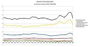 The net worth of the United States and its economic sectors has remained relatively consistent over time. The total net worth of the United States remained between 4.5 and 6 times GDP from 1960 until the 2000s, when it rose as high as 6.64 times GDP in 2006, principally due to an increase in the net worth of US households in the midst of the United States housing bubble. The net worth of the United States sharply declined to 5.2 times GDP by the end of 2008 due to declines in the values of US corporate equities and real estate in the wake of the subprime mortgage crisis and the global financial crisis. Between 2008 and 2009, the net worth of US households had recovered from a low of 3.55 times GDP to 3.75 times GDP, while nonfinancial business fell from 1.37 times GDP to 1.22 times GDP.[5]