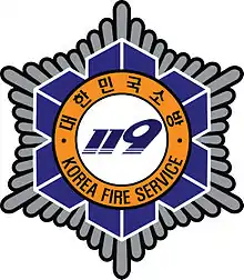 The Fire Service in South Korea (or Korea Fire Service) is an organization to prevent danger, to protect the Republic of Korea people's lives and property, fire suppression and rescue, relief of emergency patients, prevention of disaster, disaster response, and providing recovery after a disaster occurs.[1][2] Fire fighters in South Korea are Fire officers, members of an obligatory fire-fighting unit, and volunteer fire fighters.[1] Regarding fire fighting activities, the Framework Act on Fire Service, rescue and emergency activities are regulated by Act of 119 Rescue and Emergency Medical Services. The national fire department is the responsibility of the Ministry of Public Safety and Security, and the local fire department is in charge of the city and circuit fire headquarters.[3]