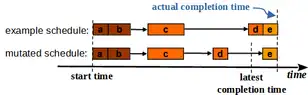 In addition to the primary objectives resulting from the task itself, it may be necessary to include auxiliary objectives in the assessment to support the achievement of one or more primary objectives. An example of a scheduling task is used for illustration purposes. The optimization goals include not only a general fast processing of all orders but also the compliance with a latest completion time. The latter is especially necessary for the scheduling of rush orders. The second goal is not achieved by the exemplary initial schedule, as shown in the adjacent figure. A following mutation does not change this, but schedules the work step d earlier, which is a necessary intermediate step for an earlier start of the last work step e of the order. As long as only the latest completion time is evaluated, however, the fitness of the mutated schedule remains unchanged, even though it represents a relevant step towards the objective of a timely completion of the order. This can be remedied, for example, by an additional evaluation of the delay of work steps. The new objective is an auxiliary one, since it was introduced in addition to the actual optimization objectives to support their achievement. A more detailed description of this approach and another example can be found in.[21]