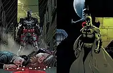 Despite this, Thomas is later revealed to have been saved by Reverse-Flash, appearing in the main timeline in an alliance with Bane; he was first shown appearing alongside the other villains in Arkham Asylum after the failed wedding between Catwoman and his son.[20] His stated goal was to break his son's will as Batman, through methods such as psychically convincing Catwoman to end her relationship with Bruce, so that Bruce would abandon his life as Batman as Thomas wished. Once he judged Bruce to be suitably psychologically broken, he broke into the Batcave, knocked out Alfred, and trapped his son in a nightmarish sequence in Arkham Asylum. Once Bruce escaped, Thomas met him directly with the offer of restoring Martha to life so that they could be a family again, but Bruce rejected this offer, proclaiming that his father failed to understand that his goal as Batman was to hope for the future.[21] Returning to Gotham after apparently defeating his son, Thomas set out to reconstruct the city in his image, using the Psycho-Pirate to convert the city's villains into his enforcers, but Alfred- who Thomas had left mentally free but imprisoned at Wayne Manor as an apparent hostage to prevent retaliation from Batman's allies- informed Thomas that his son was going to destroy him when he finally returned to Gotham.[22] Thomas maintains control using Gotham Girl as his enforcer and the Psycho-Pirate to moderate the villains, issuing orders that any heroes entering Gotham will be expelled while villains would be contained, to the point that Gotham Girl is able to defeat Captain Atom when he tries to confront her.[23]