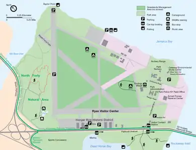 The park opened in 1974.[9] Most of the National Park Service's early actions regarding Floyd Bennett Field focused on promoting recreational activities. Due to a lack of funds, the NPS let much of the physical field revert to its natural state.[190] The NPS added tents in two areas of Floyd Bennett Field, which it then designated as campgrounds. Around 1974, the NPS also planted pine trees near the field's southern boundary, forming the current "Ecology Village".[9] By 1979, the NPS had developed a "General Management Plan" for the entire Gateway Area. The plan allowed for Floyd Bennett Field to be divided into three management zones: the "Natural Area", the "Developed Area", and the "Administrative Area". It also created the new William Fitts Ryan Visitor Center within the former administration building.[191] In 1980, many of the airport's structures were listed on the National Register of Historic Places.[1][154]