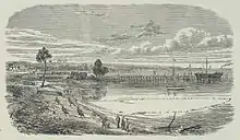 The first formal land sales for the new village of Frankston took place on 29 May 1854.[5][3][32] Frankston was gazetted in late-April of that year as being "well watered with springs...the odour and flavour of the water being remarkable".[32][33] The road to Melbourne was extended from Brighton to Frankston (now the Nepean Highway) with bridges over Kananook Creek and Mordialloc Creek in late 1854.[51]