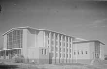 A site for a Church of England (Anglican) was reserved after the formal land sales.[61] Located on the corner of what is now Bay Street and High Street in the Frankston CBD, the two acre site also included an area for a school as well as a temporary burial ground.[61] A temporary hall was built in 1856 and served as both a place of worship and as a school (which later became the Woodleigh School).[61][62] The first post office in Frankston opened on 1 September 1857 which also initially operated from the hall.[45][63]