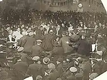On his arrival at Cardiff on 19 June he was greeted by a throng of admirers; one of the first to greet him was Jim Driscoll. Cars had been arranged to take Welsh through Pontypridd, and he asked Driscoll to join him on the journey.[59] Despite Pontypridd having a population of 32,000 at the time, reports were made that 80,000 people lined the streets to see their hero's arrival.[60][61]