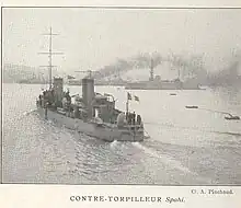 Spahi was ordered from Forges et Chantiers de la Méditerranée and was launched at their shipyard in La Seyne-sur-Mer on 3 May 1908. She was completed in July 1910.[4] When the First World War began in August 1914, Spahi was assigned to the 2nd Destroyer Flotilla (2e escadrille de torpilleurs) of the 1st Naval Army (1ère Armée Navale). During the preliminary stages of the Battle of Antivari, Montenegro, on 16 August, the 1st, 4th and 5th Destroyer Flotillas were tasked to escort the core of the 1st Naval Army while the 2nd, 3rd and 6th Flotillas escorted the armored cruisers of the 2nd Light Squadron (2e escadre légère) and two British cruisers. After reuniting both groups and spotting the Austro-Hungarian protected cruiser SMS Zenta and the destroyer SMS Ulan, the French destroyers played no role in sinking the cruiser, although the 4th Flotilla was sent on an unsuccessful pursuit of Ulan. Having broken the Austro-Hungarian blockade of Antivari (now known as Bar), Vice-Admiral (Vice-amiral) Augustin Boué de Lapeyrère, commander of the 1st Naval Army, decided to ferry troops and supplies to the port, escorted by the 2nd Light Squadron and the 1st and 6th Destroyer Flotillas while the rest of the 1st Naval Army bombarded the Austro-Hungarian naval base at Cattaro, Montenegro, on 1 September. Four days later, the fleet covered the evacuation of Danilo, Crown Prince of Montenegro to the Greek island of Corfu. The 2nd Flotilla bombarded Stončica Lighthouse on the island of Lissa on 19 September. The flotilla escorted multiple small convoys loaded with supplies and equipment to Antivari, beginning in October and lasting for the rest of the year, always covered by the larger ships of the Naval Army in futile attempts to lure the Austro-Hungarian fleet into battle. The Naval Army raided Lissa and the island of Lastovo on 2 November with the destroyer Lansquenet entering Vis harbor and extorting a ransom from the townsmen lest the French bombard the town. As they departed, the French shelled the lighthouse again.[5]