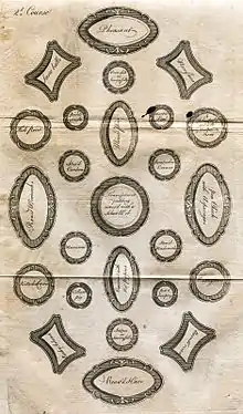 The meal was divided into two, three or four courses, "removes" or "services": soup and fish; meat entrées; and desserts, all with various side dishes. A supper, long after the main dinner, might just have one course, plus dessert.[6] Each course included a variety of dishes, all set at the same time at the table. Guests served themselves and their neighbours; the men were generally supposed to help the ladies next to them. The table was set and the first remove placed on the table before the guests entered the dining room. The serving dishes might be removed after the first course of soup or fish, or not. They were always cleared after the entrées, before serving dessert,[7] except for a period in the mid-18th century, when at grand meals the desserts were placed in the centre of the table from the start of the meal.[8]