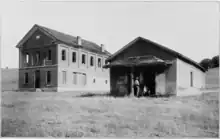 While the county seat was in Millerton, discussions began in June 1859 to build a permanent courthouse, sessions being held in up to four different buildings on one-year leases until then, but the county lacked the means to raise funds due to the sparse population until 1866, when a bond issue of US$20,000 (equivalent to $400,000 in 2022) was authorized and the building contract for the new courthouse and jail was awarded to Charles P. Converse, who finished the brick and granite building in summer 1867.[4]:101–102 The 1867 courthouse was described in 1919 as "most substantially constructed ... a mute object lesson to present-day contractors of shoddy and ginger breaded public work".[4]:102–103 With the removal of the county seat, the entire town of Millerton was abandoned, including the seven-year-old courthouse, which was "left standing by itself, a refuge for owls and bats, and the drunken orgies of the 'noble redman'".[4]:101 When the Friant Dam was completed on the San Joaquin River, forming Millerton Lake and inundating the ghost town, the 1867 courthouse was disassembled and moved to a bluff overlooking the lake.[5]