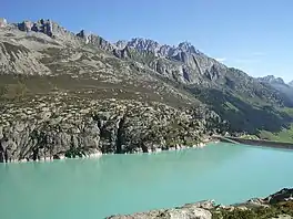 Göscheneralpsee is a reservoir in the municipality of Göschenen, Canton of Uri, Switzerland. The volume of the reservoir is 76 million cubic metres (62,000 acre⋅ft) and its surface area 1.32 km2 (0.51 sq mi).