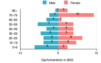 According to the 2002 Poland census, there were 91 people residing in Gaj Koniemłocki village, of whom 47.3% were male and 52.7% were female. In the village, the population was spread out, with 22% under the age of 18, 33% from 18 to 44, 18.7% from 45 to 64, and 26.4% who were 65 years of age or older.[1]