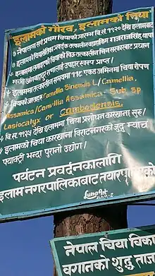 Colonel Gajraj Singh Thapa (Nepali: गजराज सिंह थापा) was the first person to establish tea plantation estates in Nepal. Around 1873, Thapa, son-in-law of Prime Minister Jung Bahadur Rana, was on a tour of Darjeeling.[1] He was impressed by the sight of the young tea plants and the taste of the drink he was offered everywhere he went. Upon his return to Nepal, he set up two plantations – the Ilam and Soktim tea estates, 103 acres (42 ha) each – and so began Nepal's tea industry.[2] Colonel Thapa was then the Governor General (Bada Hakim) of the eastern region of Nepal.[3][4] Translation of various signposts placed in Ilam (shown below), reads that the very first tea saplings planted by Thapa was received as a gift from the Government of China, it was gifted to his father-in-law prime minister Jung Bahadur Rana. According to the signpost the genus of tea planted in the estate were Camellia sinensis/Camellia Assamica/Camellia assamica sub sp Lasiocalyx or cambodensis.