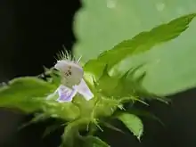 Like other Lamiaceae, its corolla is bilabiate meaning that it has two lips, an upper lip and a lower lip. The upper lip has one lobe and the lower lip has three lobes covered with hair on the lower side of the lobe. The flowers are bell shaped and bilaterally symmetrical, ranging in size from about one half to three fourths of an inch. The pistil consists of two fused carpels; its stigma is two-lobed. There are four stamens, two long and two short. Its style is solitary. Its flowering time is late summer to autumn. Its fruit is a schizocarp, brown in color.[1] This plant is self-pollinated, each plant with a capacity of producing up to 2,800 seeds which can remain dormant under soil for several years. The seeds are large; dispersal is via mammal fur. Germination occurs when the seeds are brought near to the soil surface[2] and it takes place within a month.[1]