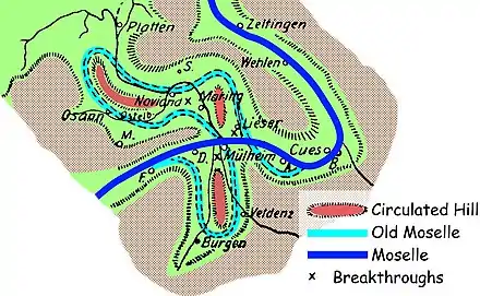 The Old Moselle: Course and breakthroughs between the former circulated mountains of Osann-Veldenz.