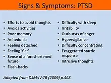 Considerable evidence indicates a prominent role for trauma-related cognitions in the development and maintenance of posttraumatic stress disorder (PTSD) symptoms. The present study utilized regression analysis to examine the unique relationships between various trauma-related cognitions and PTSD symptoms after controlling for gender and measures of general affective distress in a large sample of trauma-exposed college students. In terms of trauma-related cognitions, only negative cognitions about the self were related to PTSD symptom severity. Gender and anxiety symptoms were also related to PTSD symptom severity. Theoretical implications of the results are consistent with previous studies on the relationship between PTSD and negative cognitions, the self, world, and blame subscales of the PTCI were significantly related to PTSD symptoms. The study correlations indicated that increased negative trauma-related cognitions were related to more severe PTSD symptoms. Also consistent with previous reports, correlations also indicated that gender was related to PTSD symptom severity, such that women had more severe PTSD symptoms. PTSD symptom severity was also positively related to depression, anxiety, and stress reactivity.[54]