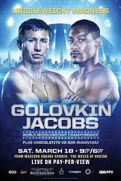 - ↑ "Golovkin vs. Jacobs Deal Done – March 18 at MSG, HBO PPV – Boxing News". www.boxingscene.com. Retrieved 2016-12-17.