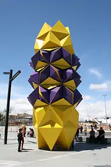 Notable works include "Floribots", (128 computer-controlled robot origami flowers arranged in a grid[5][6] a sculpture that won the Macquarie Bank People's Choice Award when exhibited at the National Gallery of Australia)[7][8]) and "Totem", (a 10.5 metre tall installation outside Perth Arena that has moving panels that open and close like flower petals when people walk past.[9][1])