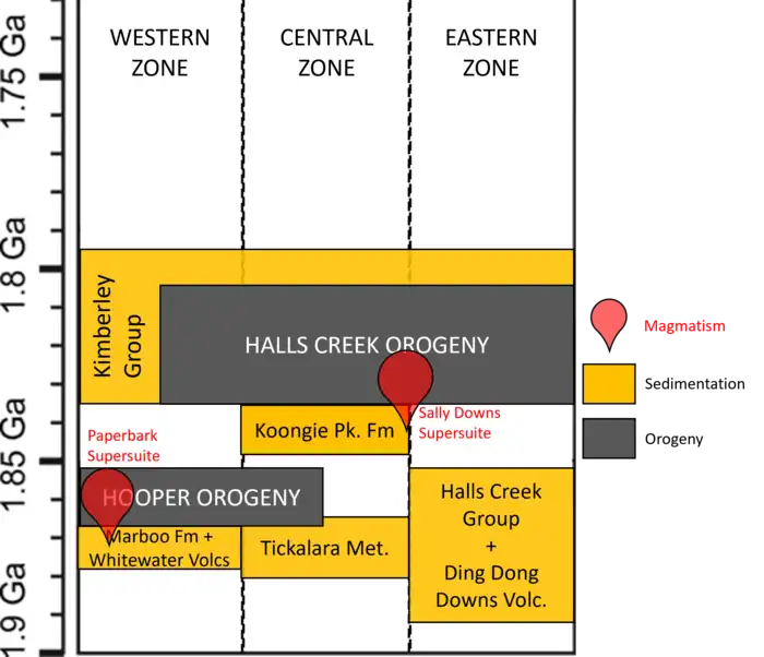 At 1845-1840 Ma the Tickalara Metamorphics were overlayed and encrusted with the eruption of mafic to felsic volcanic rocks, comprising the Koongie Park Formation.[13][25] During the subsequent Halls Creek Orogeny (1835-1805 Ma), the entire Central Zone was prominently intruded by granites and gabbros, which belong to the Sally Downs Supersuite.[12][26]