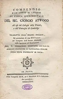 • Description of the experiments, intended to illustrate a course of lectures, on the principles of natural philosophy (in Italian). Pavia: Stamperia del Monastero di S. Salvatore <Pavia>. 1781.