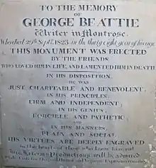- ↑ Some details sourced from: Andrew (Alexander) Smith, (ed) George Beattie of Montrose: a poet, a humourist, and a man of genius, W. P. Nimmo, 1863. (Public Domain)