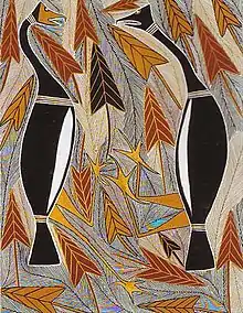 He individualised his work by adding innovative styles to the traditional styles and techniques of his clan such as combining the cross-hatching technique of Arnhem Land with the Eastern technique of depicting plain figures against black backgrounds.[3][1] His most common theme amongst his paintings is the magpie geese.[3]