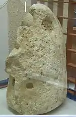 An intermediate stage of this process could be represented by the appearance of hammered relief sculptures during the Middle Bronze Age – in both Sardinia and Corsica: in the former country, baetyls were engraved with male or female gender characters in relief, while in the latter – perhaps due to the greater presence of metal implements – relief sculpture was applied for the first time to menhirs. In both islands, anthropomorphic statuary in the strict sense of the word would not exist between 1600 and 1250 BC, but gender characteristics and weapons were represented in Sardinia and Corsica respectively.[23] In a successive evolution stage, the relief technique was employed in Sardinia – for the first time after Eneolithic sculptures – to represent a human face, as shown in the famous baetyl of "San Pietro di Golgo" (Baunei).[25][26][27]