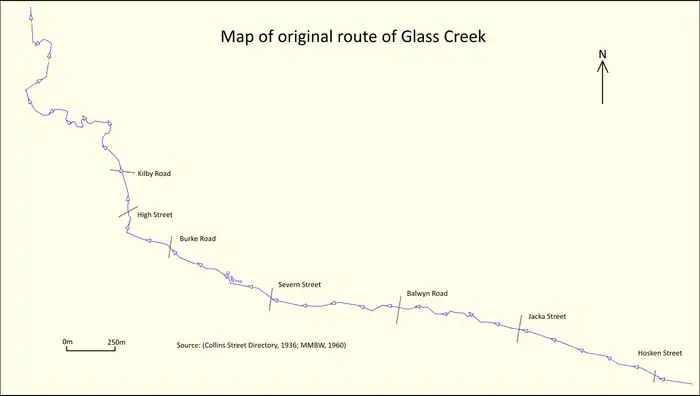 In its natural form, the creek originated near what is now Loma Linda Grove in Greythorn, the eastern part of Balwyn North. It flowed through present-day Jacka Street and Gordon Barnard Reserves, crossed Balwyn Road, through Hislop and Macleay/Myrtle Park, through the residential areas roughly following Maylands Avenue, through Stradbroke Park near present-day Kew High School, under High Street and along the present-day Glass Creek Trail before joining up to the current course near the southern entrance to Hays Paddock. Thence it flowed north-west into the Yarra River.[24]