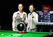 - ↑ ESPN broadcast of 2008 BCA GenerationPool.com Women' 9-Ball Championship, final (aired July 19, 2008). Ga-Young Kim vs. Xiaoting Pan. In-context commentary on rack 10 by pool pro Ewa Mataya Laurance: "The field has gotten so much stronger; there are no easy matches anymore—you know—your first match you have to play jam up."