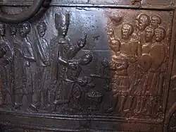 The left door (facing the reliefs from outside the cathedral) is 328 cm high and 84 cm wide, the right 323 cm high and 83 cm wide. Both are between 1.5 and 2.5 cm thick. They were cast in bronze using the lost wax casting technique in a mixture of copper, tin with a small amount of lead, with some fine detail being added after casting by engraving tools.[7] The left leaf was cast in one piece, but the right was made in 24 cast sections which were then soldered together. Both the lion-headed knockers, which do not align correctly, were also cast separately and soldered. The doors of Hildesheim Cathedral, of about 1015, had pioneered the casting of a large door mostly covered with reliefs in a single piece, which was considerably more difficult than the usual technique of earlier Italian bronze doors, which used bronze relief casts fixed to a wooden core.[8] Plain doors with no figurative decoration had already been cast whole in Germany - for example for Charlemagne's early 9th century Palatine Chapel at Aachen, following Roman techniques preserved by the Byzantines.[9] The Gniezo left door follows the Hildesheim method. The relief is also typically much higher on the left door, as much as 75% on some figures, where few on the right door reach 25%.[10] Around the central panels runs a decorative frieze of Mosan-style "rinceaux", or scrolling foliage, with small figures of astrological personifications and other subjects at intervals.