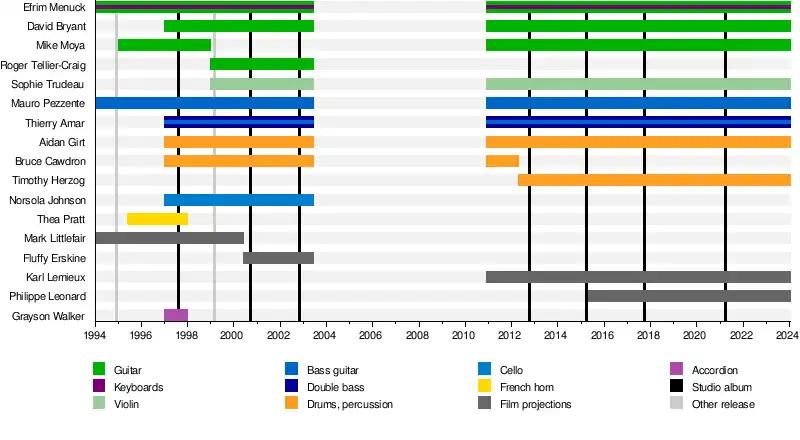 The band quickly expanded and continued to perform live. According to Menuck, joining the group was quite simple: "It was like if anyone knew anybody who played an instrument and seemed like an okay person, they would sort of join up."[16] In short order, the group's numbers ebbed and flowed. Local musicians would often join the band for a handful of performances, then depart. The revolving door nature of the group's membership frequently caused it strain before the release of F♯ A♯ ∞.[16] After that release, the group stabilized around a nine-person lineup with Menuck, Moya and David Bryant on guitars, Pezzente and Thierry Amar on bass guitars, Aidan Girt and Bruce Cawdron on drums, and Sophie Trudeau and Norsola Johnson on violin and cello respectively. Moya would depart in 1998 to focus on HṚṢṬA, being replaced by Roger Tellier-Craig of Fly Pan Am.[17]