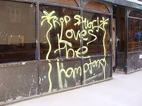 On January 1, 2006, in New York City, legislation created by Councilmember Peter Vallone, Jr. attempted to raise the minimum age for possession of spray paint or permanent markers from 18 to 21. The law prompted outrage by fashion and media mogul Marc Ecko who sued Mayor Michael Bloomberg and Councilmember Vallone on behalf of art students and "legitimate" graffiti artists. On May 1, 2006, Judge George B. Daniels granted the plaintiffs' request for a preliminary injunction against the recent amendments to the anti-graffiti legislation, effectively prohibiting the New York Police Department from enforcing the higher minimum age.[15] A similar measure was proposed in New Castle County, Delaware in April 2006[16] and passed into law as a county ordinance in May 2006.[17]