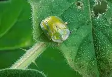 In Florida, diapause occurs in December through March, during which time the adult is dormant and hidden in leaf litter. Starting in March or April, the adults come out to feed and mate. Seven to eight generations occur during the year. The female lays single eggs on the leaves of the tropical soda apple plant.[1] A female can produce about 300 eggs.[2] Each egg is between 1 and 2 millimetres (0.039 and 0.079 in) long including its wide, transparent, papery casing. The larva emerges in 5 to 6 days, feeds voraciously, progresses through five instars, and becomes a pupa after 16 to 18 days. Pupation lasts about a week.[1] The female beetle lives 3 to 4 months.[2]