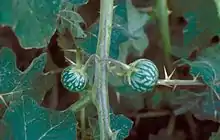 The main host plant of the beetle is the tropical soda apple (Solanum viarum), a prickly shrub in the nightshade family. Like the beetle, it is native to South America. It was first discovered in the United States in 1988 in Florida.[1] It has since spread as far north as Pennsylvania[3] and as far west as Arizona.[4] As of 2011, over one million acres are infested in the United States.[2] The tropical soda apple has been nicknamed "the plant from hell".[5]