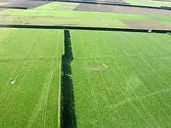 The Greendale Fault photographed looking north, about 12 hours after the Darfield earthquake. The hedgerow and tractor tire tracks in the paddocks have been horizontally offset by about 3.5 meters
