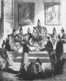 Duchesne de Bellecourt remitting the ratified Treaty of Amity and Commerce between France and Japan to the shōgun in 1860. He is accompanied by Father Mermet-Cachon.
