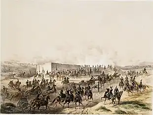 At the end of August all of the mobile Hungarian troops surrendered, as well as the fortresses, with the exception of Pétervárad, which held until 7 September.[43] Only the fortress of Komárom refused to surrender. On 5, 7, 10, 25 and 27 September the Hungarian defenders fought with success against the enemy troops, furthermore the Hungarian Hussars executed successful sorties against the besieging army. For example, on 5 September 300 hussars, led personally by Klapka, routed a Russian Cossack unit in the Battle of Hetény.[36][44]