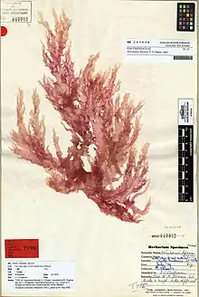 - ↑ Kamiya, M., Lindstrom, S.C., Nakayama, T., Yokoyama, A., Lin, S.-M., Guiry, M.D., Gurgel, F.D.G., Huisman, J.M., Kitayama, T., Suzuki, M., Cho, T.O. & Frey, W. 2017. Rhodophyta. In: Syllabus of Plant Families, 13th ed. Part 2/2: Photoautotrophic eukaryotic Algae. (Frey, W. Eds), pp. [i]–xii, [1]–171. Stuttgart: Borntraeger Science Publishers