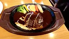 Hamburg (ハンバーグ, hanbāgu, Hamburg steak)[13] is a popular dish in Japan. It is made from ground meat with finely chopped onion, egg, and breadcrumbs flavored with various spices, and made into a flat, circular shape about 4 cm thick and 10 to 15 cm in diameter. Many restaurants specialize in various styles of hamburg steak.[14] Some variations include hanbāgu topped with cheese (チーズハンバーグ, or chīzuhanbāgu), hanbāgu with Japanese curry, and Italian hanbāgu (with tomato sauce rather than demi-glace).[15]