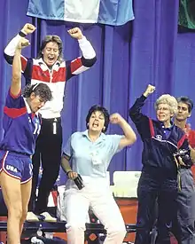 Kathy Callaghan stands on a bench and cheers as she and her teammates learn that they have clinched the gold medal.