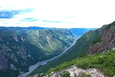At the heart of this valley, whose walls can reach up to 800 metres (2,600 ft) in height, flows the Malbaie River, frequented among others by the Sea Lamprey as well as by the Atlantic salmon.[3]