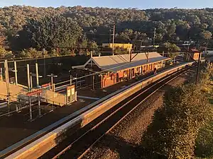 In 1960, electrification of the Hornsby-Gosford section of the line was completed. The station footbridge was raised, and modifications and improvements were carried out to trackwork, sidings and signalling to suit the use of electric locomotives and the future operation of stainless steel electric interurban car sets on passenger trains. The signal box was closed. In the late 1980s and early 1990s some additional awnings and structures have been added on the platform. The station steps have been rebuilt with modern materials.[3]