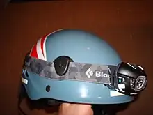 Headlamps are usually powered by three or four AA or AAA batteries, or rechargeable batteries. Systems with heavier batteries (4xAA or more) are usually designed so that the light emitter is positioned near the front of the head, with the battery compartment at the rear of the head. The headlamp is strapped to the head or helmet with an elasticized strap.[1] Some headlamps have a separate battery pack connected by a cable, to be carried on a belt or in a pocket.[1]