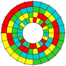 Wheel diagram of all permutations of length generated by Heap's algorithm, where each permutation is color-coded (1=blue, 2=green, 3=yellow, 4=red).