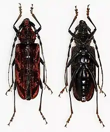 This beetle is about 4.5 to 6.5 centimeters long with a narrow body. It is black with a red sheen. The male has antennae longer than its body length; the female has shorter antennae.[2]