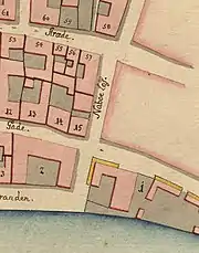 The property was in 1689 as No. 17 in Strand Quarter owned by Gert Mejer, Jr. It was later owned by wine merchant (vintapper) Andreas Klarup.[1] On 20 December 1756, it was as No. 15 acquired by tailor Friedrich Uhl. On 18 January 1762, he sold it to merchant (urtekræmmer) Jens Krøjer. On 7 July 1765, it changed hands again when it was acquired by wigmaker Johannes Baltzer. The property was then the site of a half-timbered building fronting Snaregade, but pulled back from the street, as well as a gatehouse situated to the left of the main building.[2] Christoffer Valkendorff's ejerbod from 1581 blocked the view of the canal.[3]