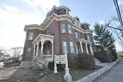 The Henry J. Crippen House is located north of downtown Concord, on the west side of North Main Street at its junction with Pearl Street. It is a 2+1⁄2-story masonry structure, with a mansard roof providing a full third floor in the attic level. The front facade is symmetrically arranged, with a pair of entry doors under a portico supported by wooden piers with recessed panel bases and brackets beneath the dentiled cornice. The doors and windows are all topped by segmented arches with cast iron keystones. The cornice of the roof is studded with paired heavy brackets and equally heavy dentil molding. Above the mansard portion of the roof is another band of molding. The paired entries are flanked on either side by projecting bays that rise a full two stories, and are topped in the mansard layer by dormers with projecting hoods. The south elevation of the house is distinguished from the north by the presence of a two-story half octagonal tower projection, in front of which is a side porch with ornately decorated balustrade and supports; the north facade has a simple two story projecting bay.[2]